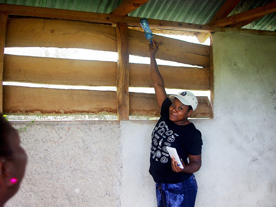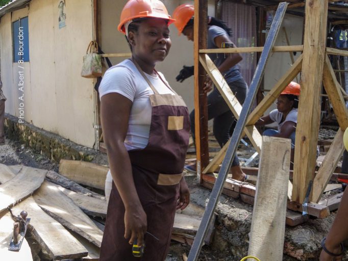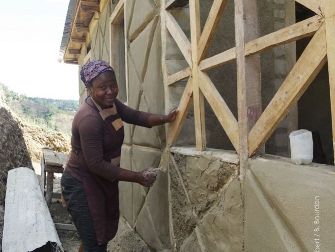Après deux ans de formation sur les chantiers-école mis en place par Habitat-Cité et Ojucah à La Vallée (Sud-Est de Haïti), Margarette continue à affirmer son goût pour la construction écologique. Début 2019, elle a bénéficié d’une formation proposée par Caritas Suisse. Le but était de se qualifier afin de piloter une formation en construction en matériaux locaux à destination de femmes de la commune des Cayes. Margarette en est revenue enthousiaste et convaincue du rôle qu’elle peut jouer dans la reconnaissance du statut des artisanes à Haïti, les « femmes bòs ».